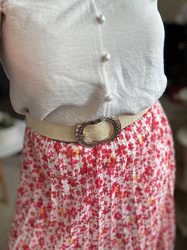 Apportez une touche bohème chic à votre collection avec notre ceinture élastique tissée, ornée de doubles boucles dorées.