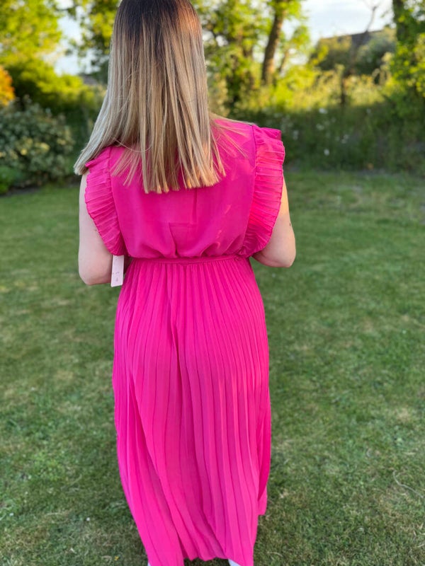 Adoptez un look frais et raffiné avec cette robe longue plissée fuchsia🌸. Son col V élégant apporte sa touche de féminité et de légèretéđź‘—.
