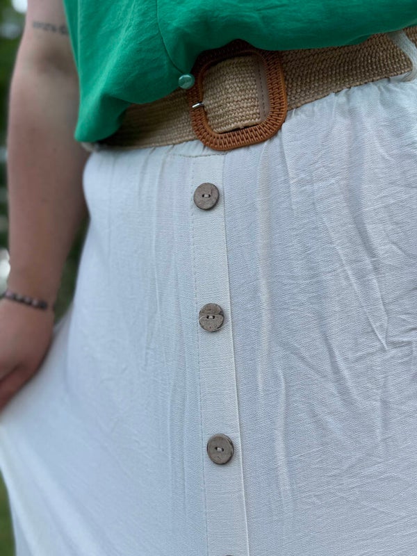 La jupe écrue qu'il vous faut ! Sa taille totalement élastique et ses boutons décoratifs ajoutent une touche