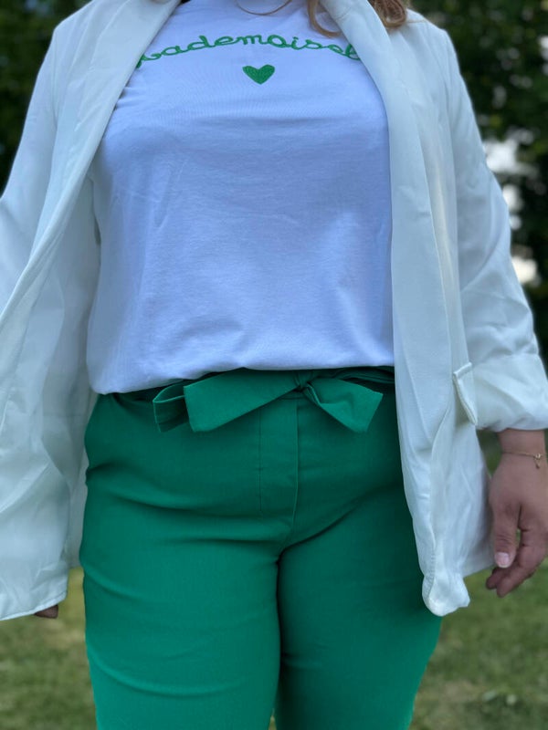 Alliez confort et élégance avec notre pantalon à noeud vert. Conçu dans une matière extensible, il épouse parfaitement votre silhouette tout en offrant une liberté de mouvement optimal. Sa taille élastique avec noeud décoratif ajoute une touche fémine et stylée.🤍