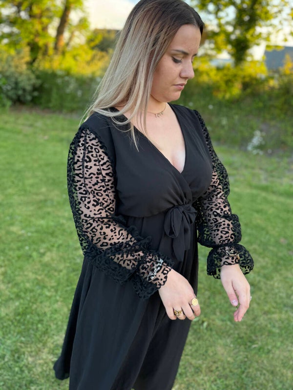Élégante & chic cette robe a tout pour plaire. Les manches sont longues transparentes à motifs noir léopard. Son col en V avec une ceinture ajustable à votre taille. Son petit dos nu super joli !😍