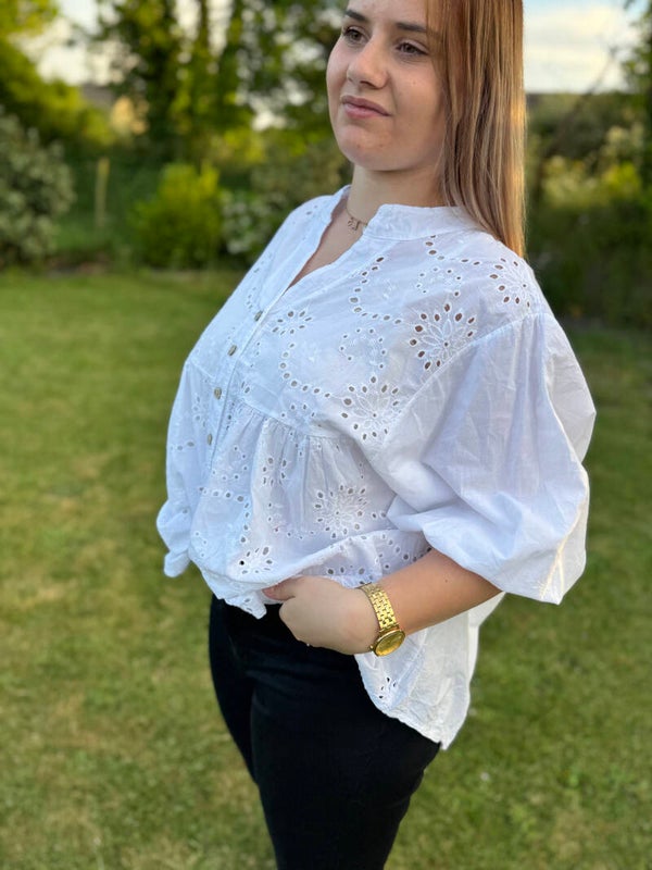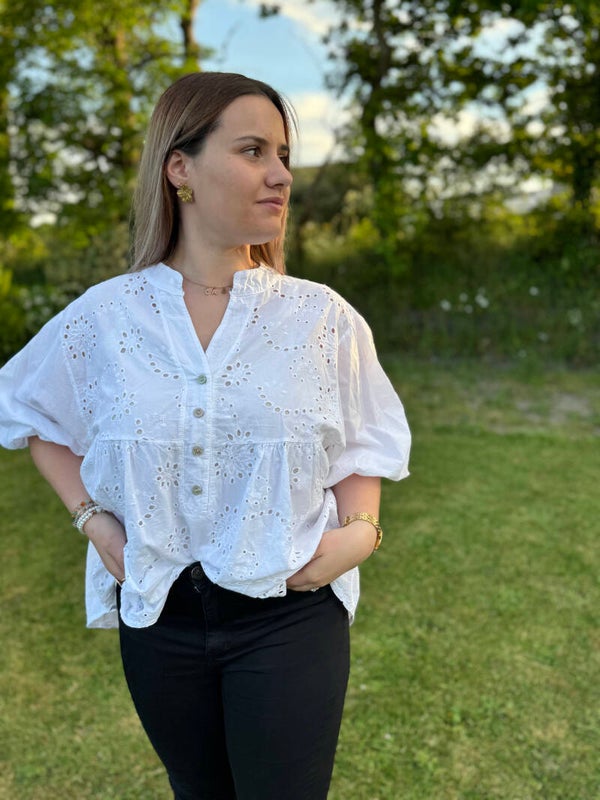 Blouse en broderie anglaise épouse délicatement la taille tout en conservant une coupe évasée pour un confort élégant. La rangée de petits boutons nacrés court le long de l'encolure en V, ajoutant une touche d'authenticité.✨
